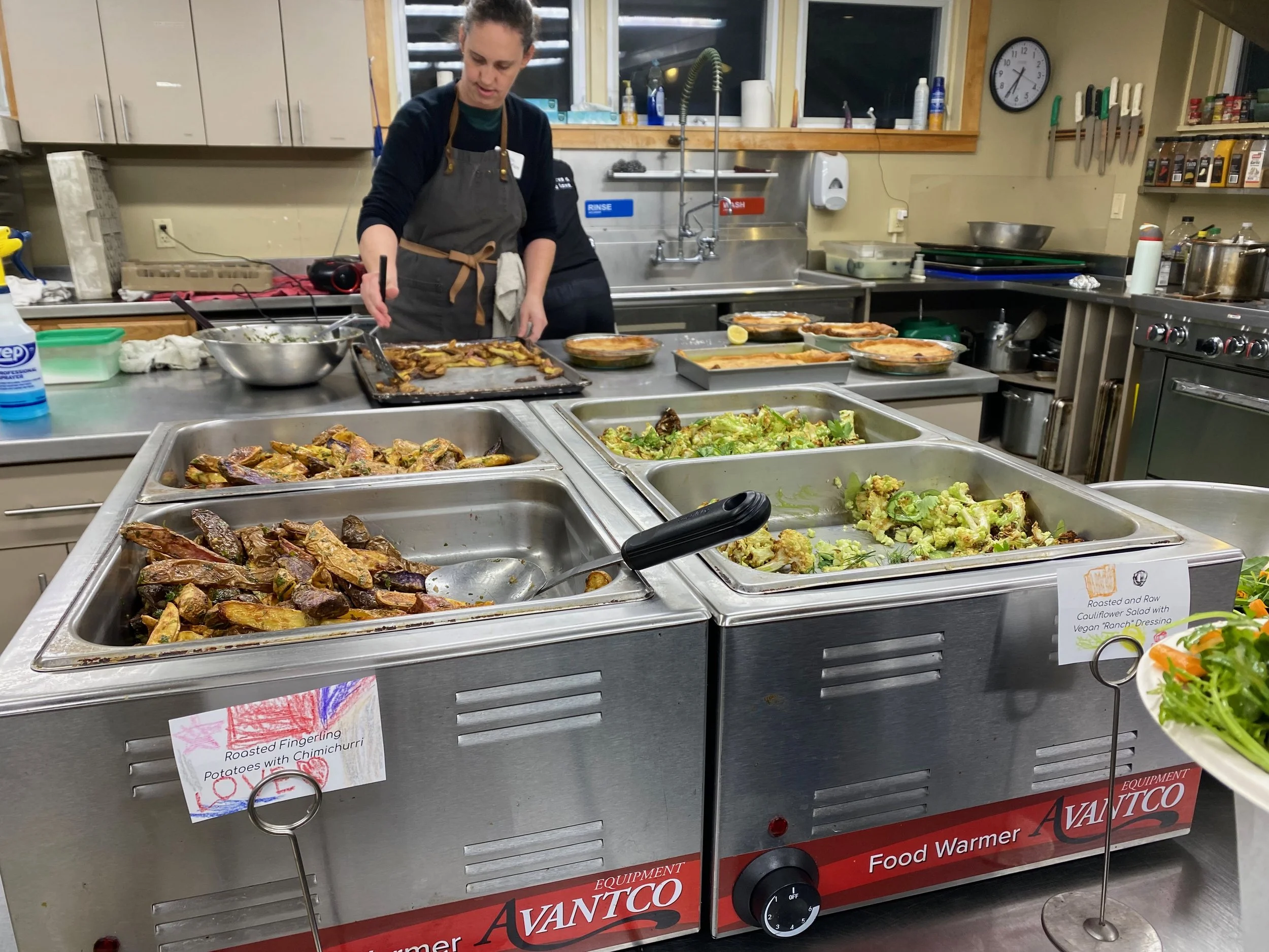 Hilary Leifsen and Brenna Haase prepare the evening’s locally sourced and plant-based meal, consisting of items straight from the campus garden. (Source: Sr Marjorie Lawless, retired, Norwood Fontbonne Academy)