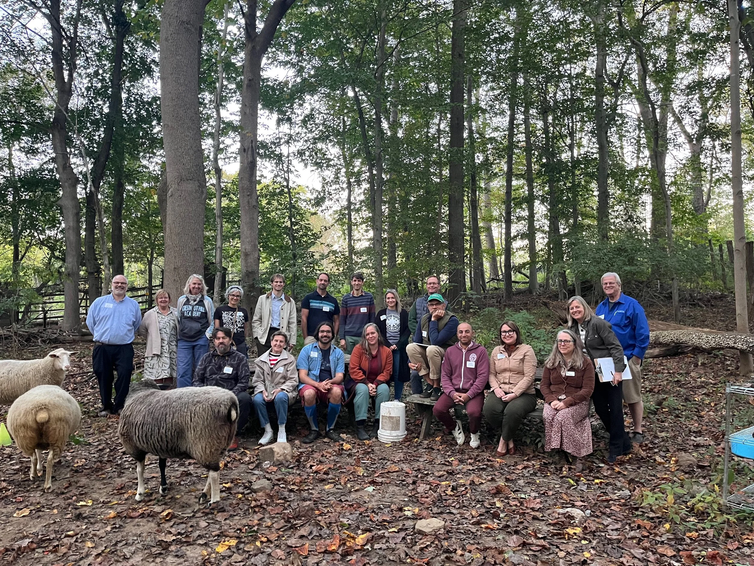 The meeting’s attendees gather in the outdoor classroom, with the school’s three ewes. At SRV students have hands-on learning experiences with their environment, food, and sustainability choices. (Source: BSEC)
