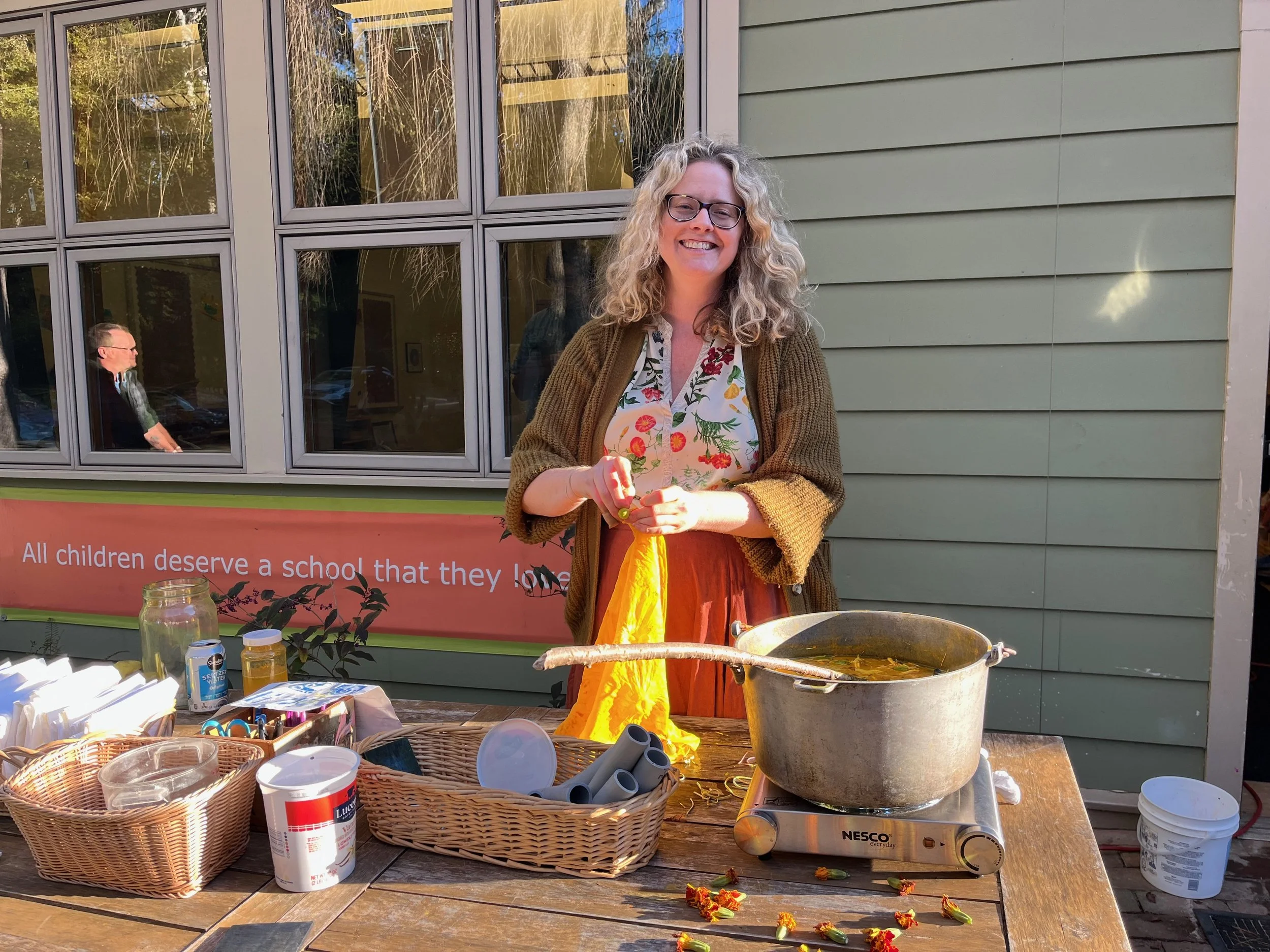 The tour concluded in SRV’s outdoor classroom, where students learn practical skills such as foraging and fire-building. Rule emphasized the strong sense of community at SRV that makes their sustainability initiatives possible. From parents volunteering to help build the outdoor classroom to ongoing collaboration and planning among teachers, it’s clear that the lessons learned in the campus garden and classroom extend far beyond science projects, shaping every aspect of students’ and staff’s learning and growth.